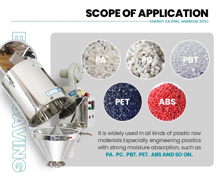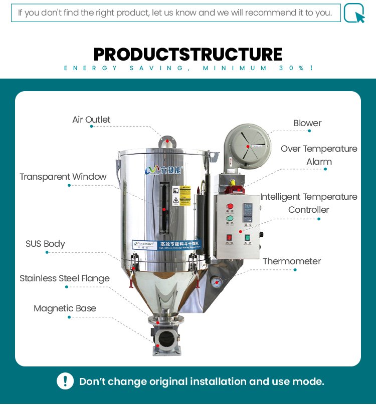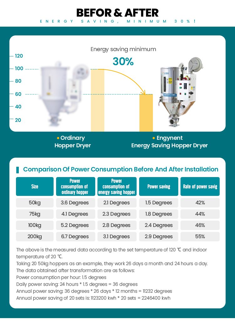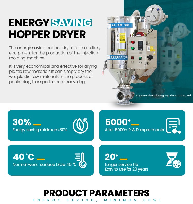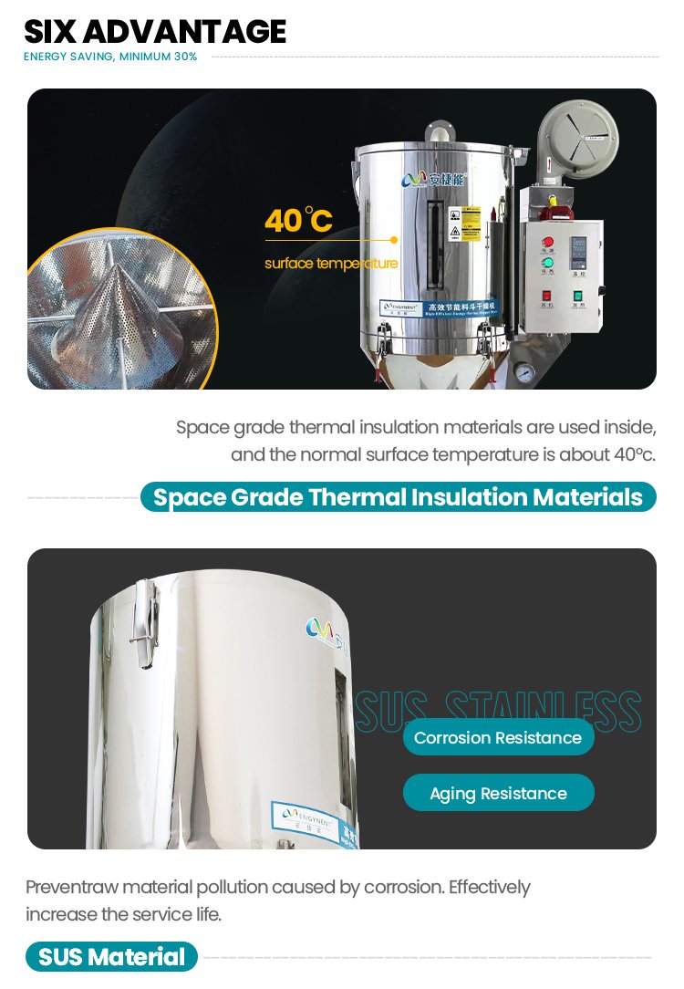 Энергосберегающая сушилка для пластика может напрямую заменить обычный бункер. По сравнению с обычным бункером, весь материал изготовлен из нержавеющей стали, которая эффективно противостоит коррозии и старению, предотвращает загрязнение сырья, вызванное коррозией, и значительно увеличивает срок службы. Интеллектуальный ПИД-регулятор температуры используется для оптимизации подачи воздуха, что обеспечивает экономию энергии более 30%.