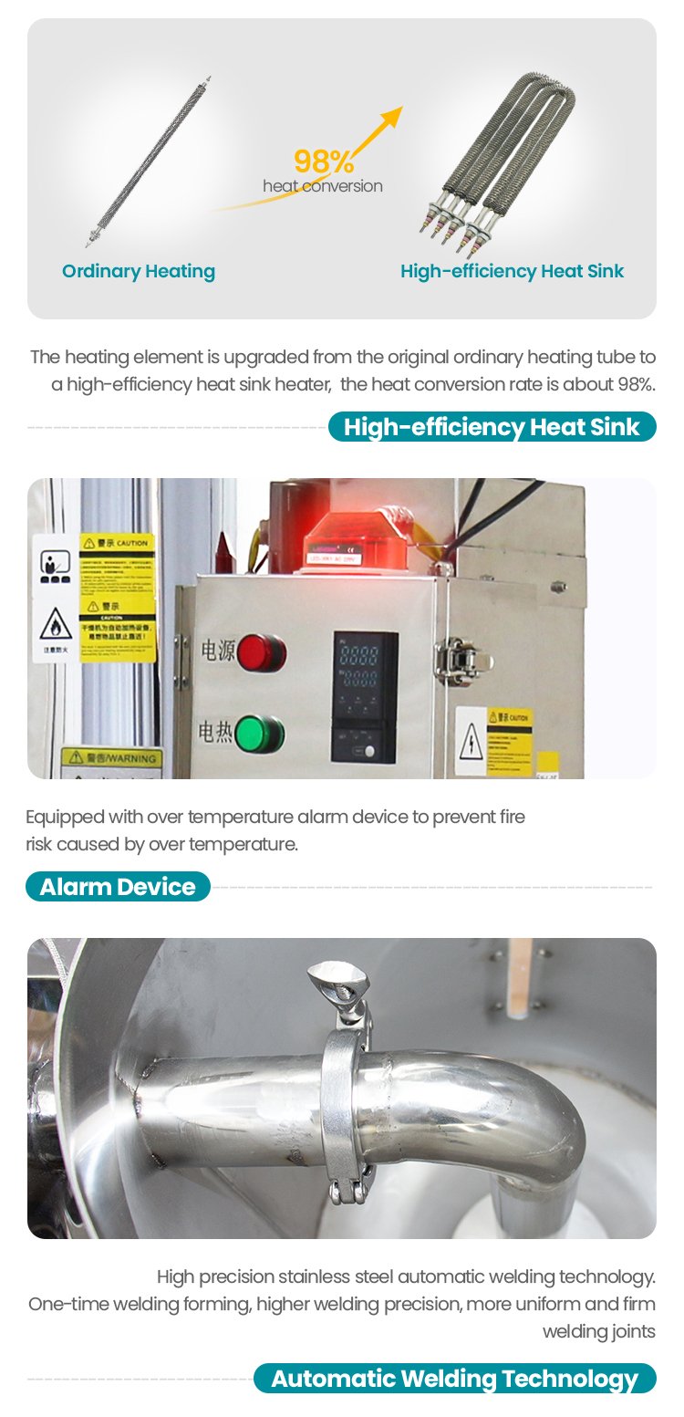 Энергосберегающая сушилка с бункером использует линейный ПИД-регулятор, который позволяет точно контролировать температуру с точностью до +-1 °C. Эффективность сушки сырья высокая. Благодаря трем термопарам чувствительная система сигнализации о перегреве эффективно устраняет проблемы сгорания/спекания сырья в старой сушилке, значительно повышая безопасность производства и снижая производственные затраты.